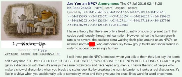 The “NPC” meme, as many Internet things do, started on 4chan. The original post formed a theorization of the “NPC” lot in real life, due to a reincarnation-based fixedness in the amount of conscious souls there can be in the world. The leftovers — the real-life NPCs — are these lifeless people we see every day but barely notice, who lack an “inner voice” and just spout out buzzwords and hackneyed arguments they hear from mass media.