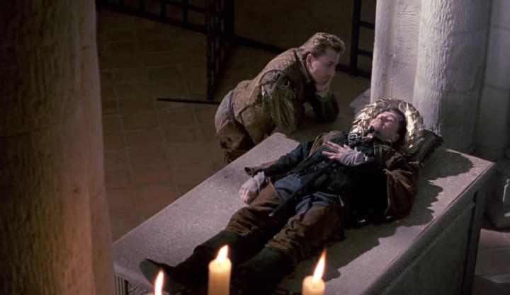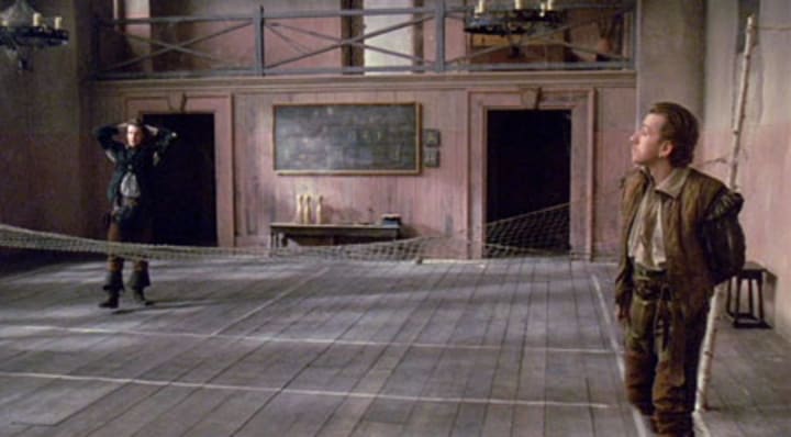 Rosencrantz & Guildenstern Are Dead (1990), however, imagines them as real people. Not as PCs, or potential protagonists worthy of their travels in Hamlet’s Denmark together, but as actual persons that have been drawn into a world that they cannot explain nor wield any real control over. Events “play themselves out to aesthetic, moral and logical conclusion,” as the theater troupe Player tells them, and we get to see R and G’s true personas primarily as a response to their liminal environments, a world that is not for them.