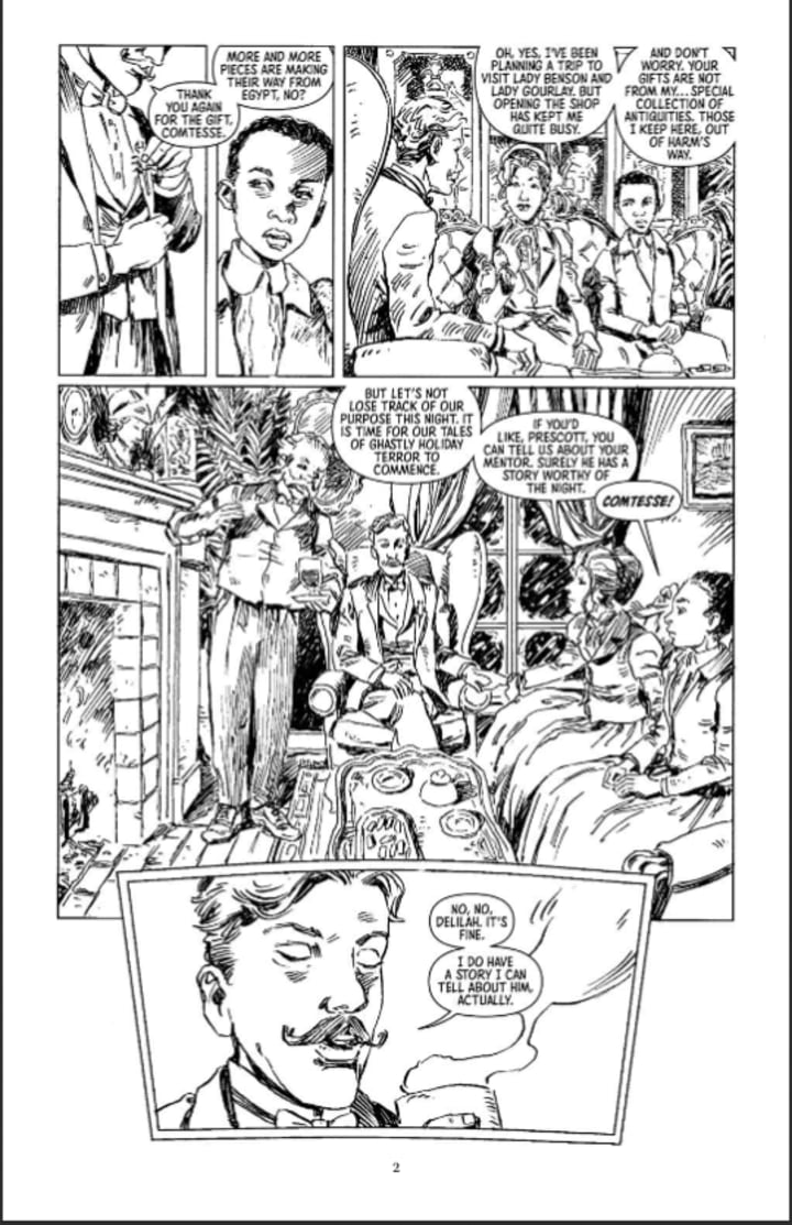 With a break in the action, Prescott, Delilah and the Comtesse gather ‘round the hearth to share the Victorian Christmas tradition of ghost stories with each other. As the stories unfold, each crafted by a different comics creator, the night builds to the biggest shock of all…!