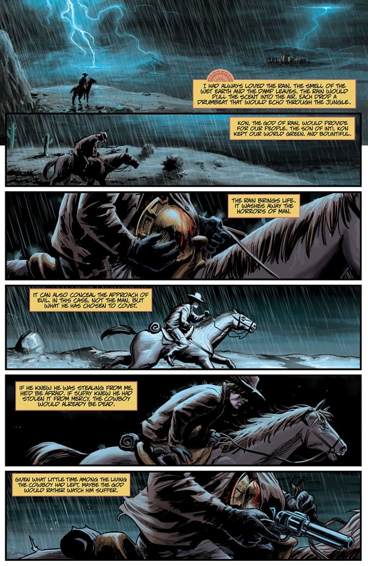 With each issue I am getting into this more and more. I found or find myself getting so engaged in this that I have even begun to think about why and how this gang is able to exist in this time period. It is just written so well that you cannot help but think beyond what we find on the page and think about life and circumstances from back then. If a story can do this to you then you know it’s incredibly well written. Plus there’s the backstory featuring the Mexican, or Incan/Mayan, culture that adds a whole slew of other ideas and possibilities of what we see and their beliefs really makes this so gosh darn intriguing.