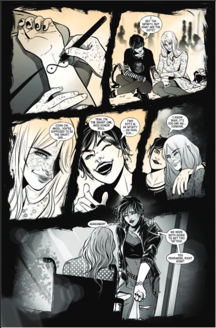 Maybe it’s just me but it seems that Angel is getting more and more reckless as the issues come out. I get feeling frustrated and that being a teenage girl can be a difficult and trying time, not to mention that she thinks she’s a whole lot better at this than she actually is but she’s not slowing down at all. She keeps going full steam ahead and ignoring all the things that need to be done properly if she’s going to do what she’s set her mind to. Including but not limited to how she feels about Sarah are the motivating factors that also happen to be what distracts her from being the best she can be. That she lets her emotions control her and that she’s found what drinking is like I just want to see her sliding downhill even further.