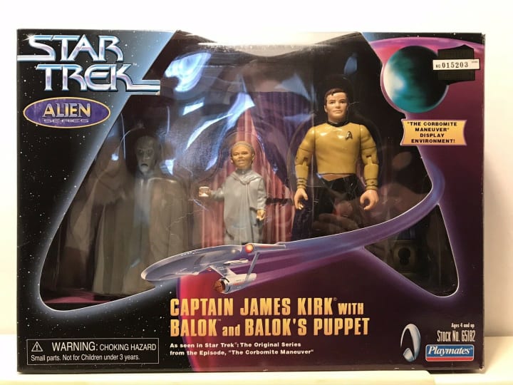 Lt. Spock (Leonard Nemoy) obtains a visual of Balok, who appears to be a blue/green humanoid with facial features that are constantly shifting and difficult to define. Kirk decides to bluff the alien by telling Balok that the Enterprise contains "corbomite", a substance that will automatically destroy any attacker.