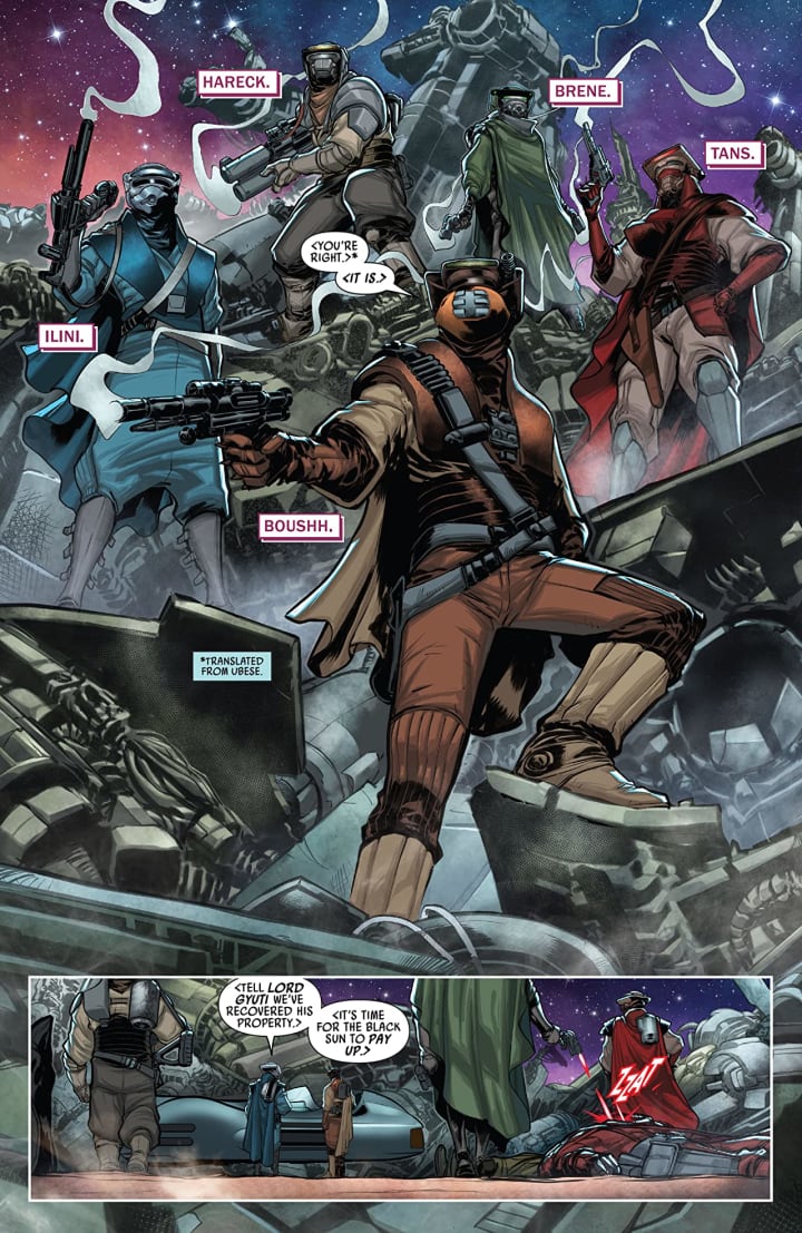 Here’s one of the things about these that I love, I have no idea who these characters are but with these one-shots I am getting that opportunity to get to know them. I mean Boushh and his team may not be essential to the story but they are at the whole Crimson Dawn auction and this is the story how they get invited to it. It is a nice side note and while a non-essential story it is one that’s fun to read.