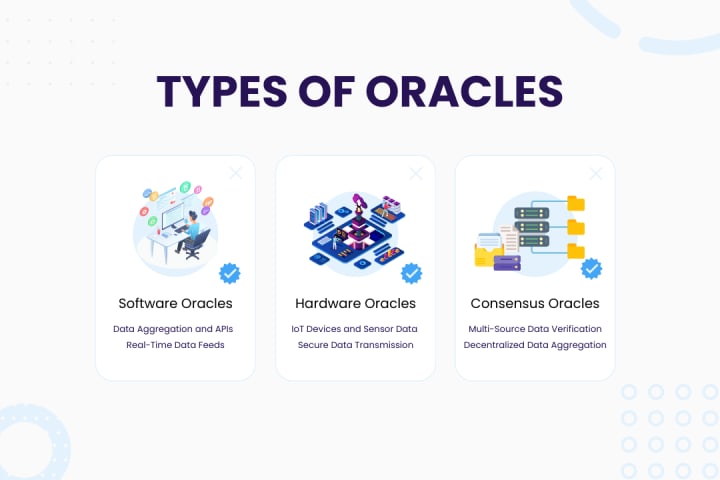Oracles in blockchain can be categorized into several types based on their functionality and data sources.