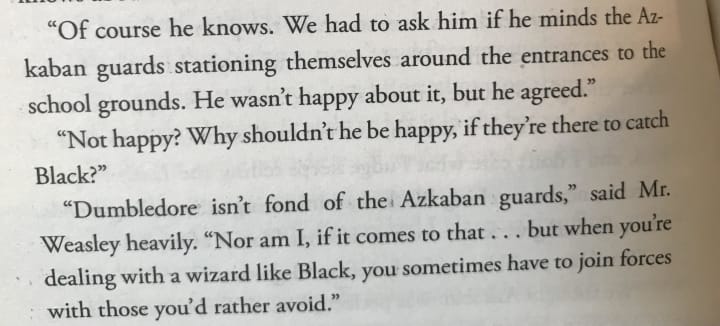 To prove my claim, let’s take a look at the context around each time someone says “Azkaban guards” in the first four chapters.