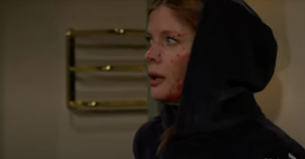 As she stands she looks traumatized Y&R viewers can see her face is splattered with her husband's blood. There were no scissors in sight when they were talking earlier so something happened that led Phyllis to grab those scissors and use them as a weapon of self-defense. What's not clear is if Phyllis killed Jeremy to prevent him from raping her or if she murdered him after the deed was done.