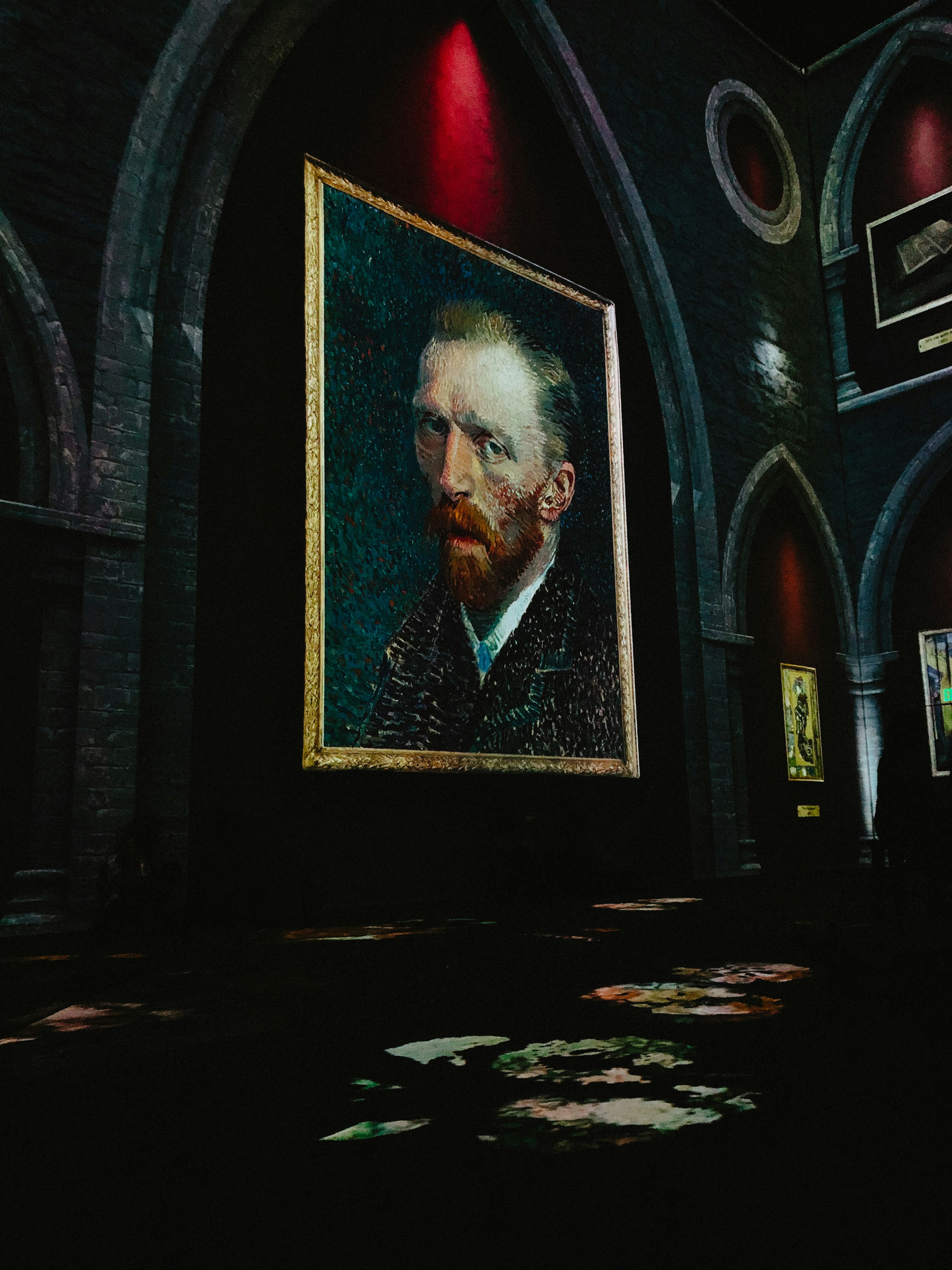 The following picture was taken in Atlanta, GA, at an exhibit. I’m not sure if this was at the Vincent van Gogh expo, but I thought it was an interesting display. I love the gothic cathedral arches and red lighting against the dark walls. This is one of many self-portraits he painted throughout his career.