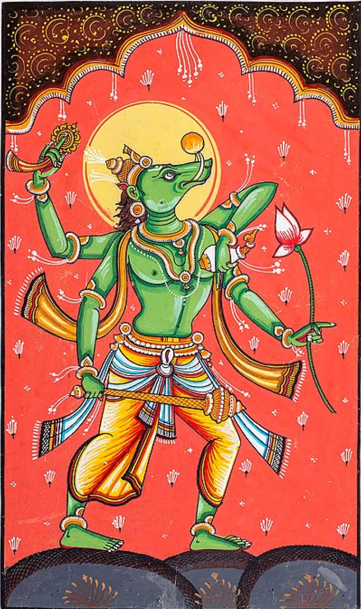 3.Varaha (the boar) — In the form of a boar, Lord Vishnu rescued the Earth (personified as the goddess Bhudevi) from the demon Hiranyaksha, who had submerged it in the cosmic ocean. Varaha represents the protection of the Earth and the restoration of order.