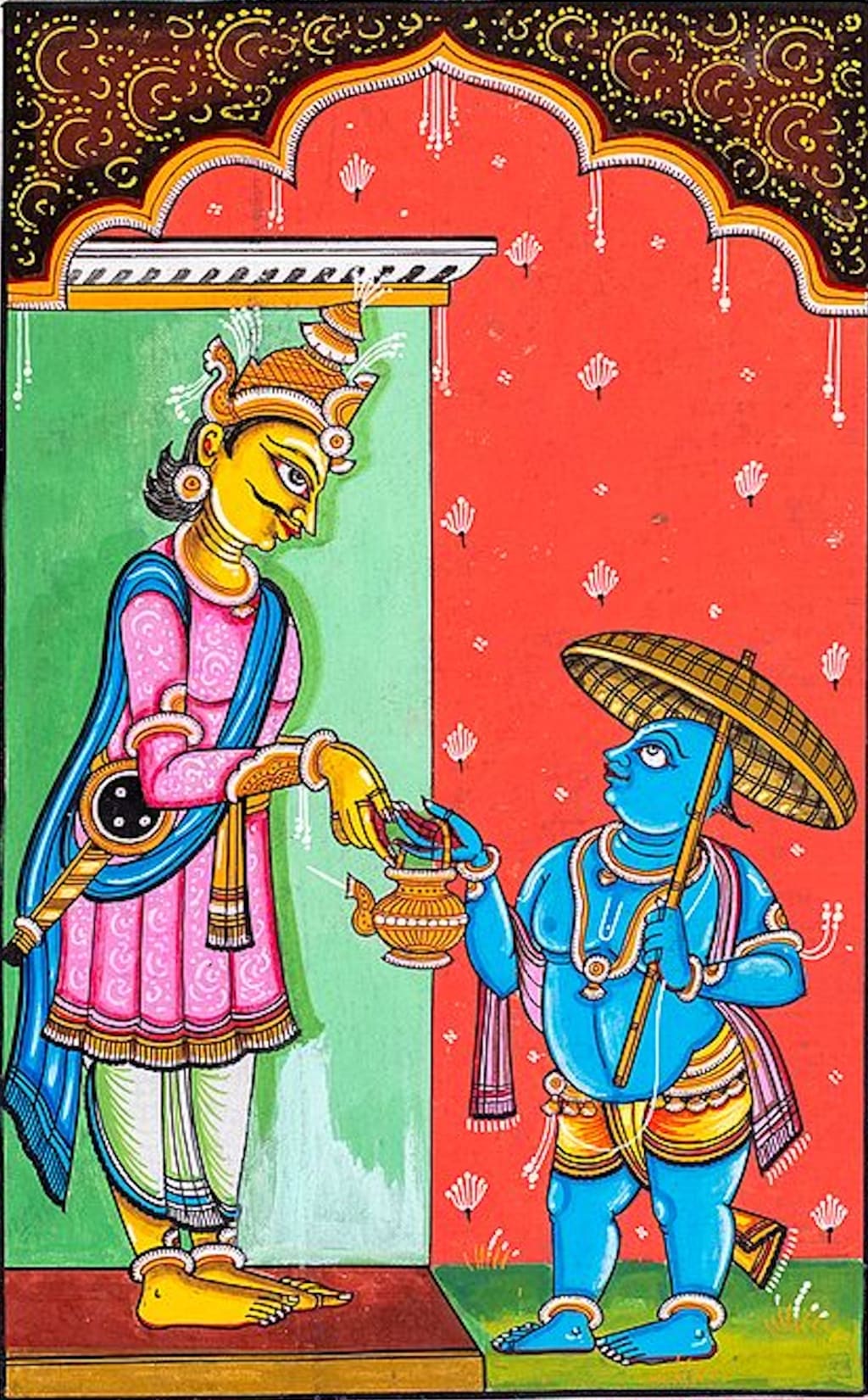 Bali, being a noble and charitable king, agreed to the dwarf Brahmin's request without hesitation. He extended his arm, granting Vamana permission to measure the land. To the astonishment of everyone present, Vamana began to grow in size, expanding to cosmic proportions with each step.