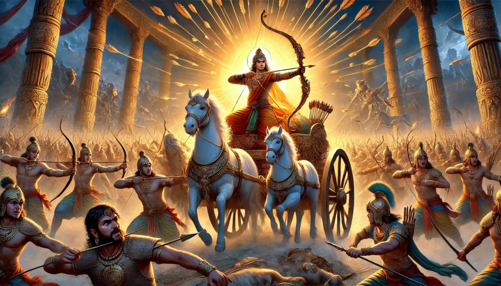 In the battle that followed, Arjuna used his celestial weapons to overwhelm the Kaurava forces. His strategic brilliance and unmatched skill turned the tide of the conflict, and the cattle were safely recovered. Uttara Kumara, witnessing Arjuna’s heroism firsthand, was filled with admiration and gratitude.