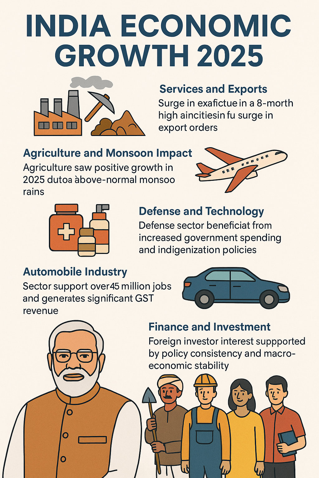 Despite global economic uncertainty and geopolitical tensions, India's economy has demonstrated strong resilience and robust growth. India's GDP grew by 8.2% during the fiscal years 2024–25, the highest among major global economies. Manufacturing, mining, services, agriculture, consumer goods, healthcare, defense, and automobiles are just some of the key industries that are driving this expansion.In the October–December 2024 quarter, India's manufacturing sector experienced growth of 11.6%, the highest rate in the previous six quarters. The government's "Make in India" and "Production-Linked Incentive" (PLI) programs, which attracted foreign investment and increased domestic production, are to blame for this surge. Mining also contributed significantly to the GDP, thanks to increased mineral extraction and infrastructure development.India's business activity reached an 8-month high in April 2025 thanks to an increase in export orders and improvements in manufacturing. The service sector, particularly IT, finance, and logistics, played a major role in this boost. As a result, more jobs were created and consumer confidence was raised.Over 45% of India's workforce is employed in agriculture, which contributes approximately 15% of GDP. In 2025, monsoon rains that are 5 percent above normal are predicted to increase crop yield, stabilize food prices, and assist the central bank in managing interest rates.In 2025, household names like Hindustan Unilever, ITC, and Nestlé experienced growth ranging from 9 to 11%. Reduced corporate taxes, lower interest rates, and increased rural consumption are some of the factors. The healthcare sector also expanded due to rising domestic demand and government investment.Indigenization policies, public-private partnerships, and increased government spending have all benefited India's defense industry. The economy still relies on technology, particularly software exports and IT services, which generate millions of jobs and foreign exchange.Over 45 million Indians work in the automobile industry, which significantly boosts the country's GDP. This industry also generates substantial GST revenue for the federal and state governments, with a turnover of around 7.5 lakh crore per year.Banking and insurance, in particular, continue to operate in a stable and growth-oriented financial sector in India. Foreign investors continue to show strong interest due to India’s policy consistency and macroeconomic stability.India faces challenges such as the effects of climate change, volatile global markets, and shifting domestic demand despite these strengths. However, India is well-positioned to overcome these obstacles thanks to strategic policy reforms, infrastructure investment, and digital innovation.In 2025, the economic momentum of India is shaped by the combined efforts of numerous sectors. Its ability to sustain high growth, attract investment, and create jobs amid global challenges positions India as one of the fastest-growing major economies in the world today.The construction of infrastructure has been one of the most important factors in India's rapid economic growth. Bharatmala Pariyojana, PM Gati Shakti, and other significant government initiatives have significantly improved connectivity and logistics efficiency throughout the nation. In order to enhance supply chains, rapid upgrades are being made to rail and road infrastructure. With investments in rural broadband, data centers, 5G rollouts, and India's digital infrastructure, the digital divide between urban and rural areas has been reduced. India's infrastructure boom makes it more appealing to foreign direct investment (FDI) in addition to supporting domestic businesses.India is now the third-largest startup ecosystem in the world, with over 100 unicorns as of 2025. The Digital India program has accelerated the adoption of fintech, e-commerce, edtech, and healthtech. With its monthly processing of billions of transactions, UPI (Unified Payments Interface) has revolutionized digital payments. While established companies like BYJU'S, Paytm, Zomato, and Nykaa are expanding globally, innovative new players are upending established industries. Millions of jobs have been created as a result of the growing startup culture, particularly in Tier 2 and Tier 3 cities.Over 65% of India's population is under the age of 35, making it a young nation. The government is making significant investments in the following to take advantage of this demographic dividend: Mission in Skill India NEP 2020 is a new policy on education. expansion of vocational education and higher education In particular in fields like artificial intelligence (AI), robotics, data science, and clean technology, these initiatives aim to create a workforce that is ready for the future and can compete globally.