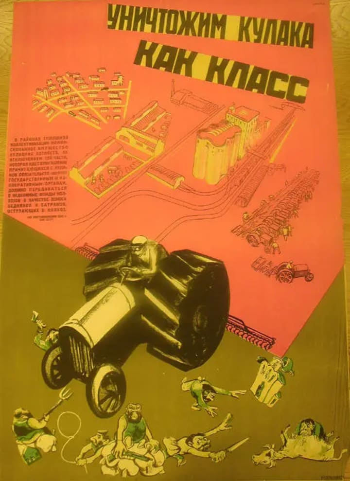Collectivization then led to bigger issues like decreased production, and disorganization of rural economies. Collectivization put the control of Ukrainian grain exports to the west back into Stalin’s hands, giving him the funding for industrialization and the control of the region entirely. Members of Stalin’s communist party and members of the secret police or GPU, would be sent to the Ukrainian countryside to force people to relinquish their land, property, livestock, farming equipment, and even housing for it to be owned by the state. Many Ukrainian farmers resisted Stalin’s plan and ideas since they had been independent for as long as they could remember. This resistance only infuriated Stalin making him come up with other ways to attack them in hopes they would eventually give in and turn everything over to the state, Stalin would give those who opposed the ideology the name Kulaks, a Russian term used to refer to a wealthy peasant but literally translating to “a fist.” A state run propaganda campaign would be launched to depict them as greedy pigs who were enemies of the state, in an attempt to show others especially those of poorer backgrounds that kulaks are stealing from the poor.