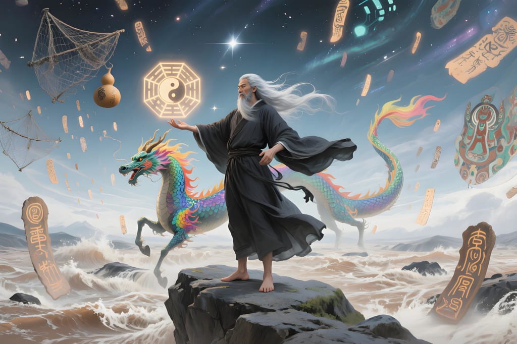 By chance, Fuxi was walking along the Yellow River one day. Suddenly, a divine dragon - horse leaped out of the river. The strange patterns on the horse's back caught Fuxi's attention. This was the famous "Hetu" (River Map). At the same time, he observed the changes in the natural world around him, such as the alternation of the four seasons and day and night. These phenomena seemed to convey some mysterious messages to him. This series of discoveries provided an important opportunity for Fuxi to achieve his goal.