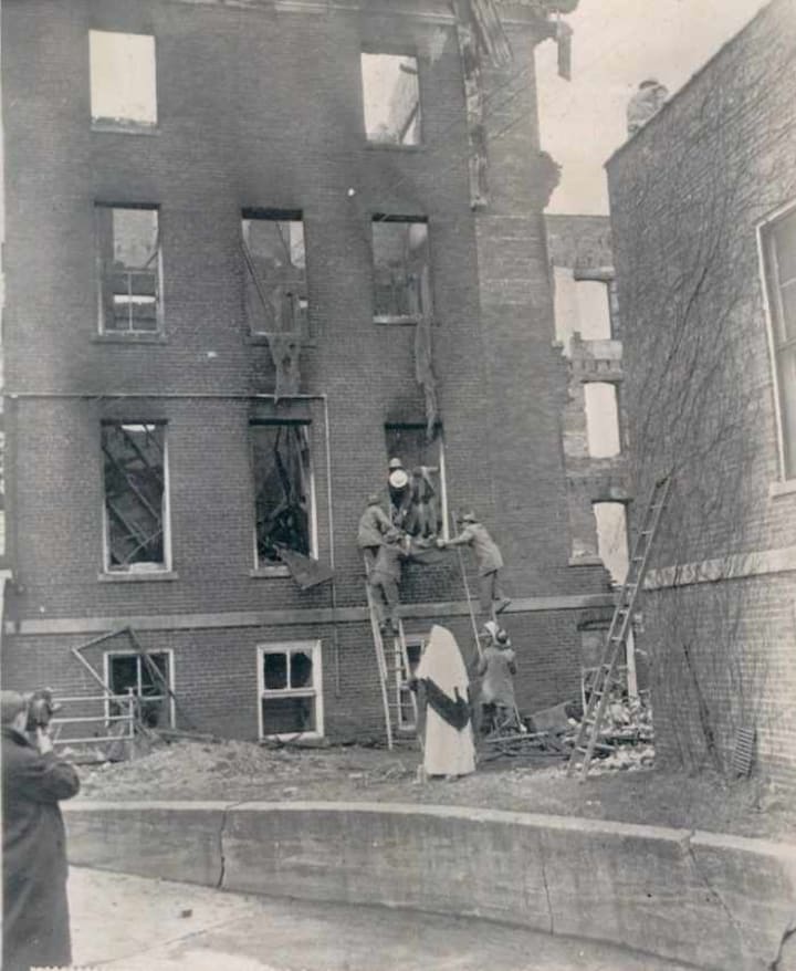 Fern Riley, a 22-year-old practical nurse who worked in the second-floor nursery, refused to leave and died with the 11 newborns there. Others were jumping to escape the flames, but she undoubtedly saw no way to get the fragile babies to safety. Her body was later found in the nursery with them. Fern grew up in the nearby town of Holliday, Illinois, one of a family of ten children. Her story was featured in a number of newspaper and magazine articles about the tragedy.