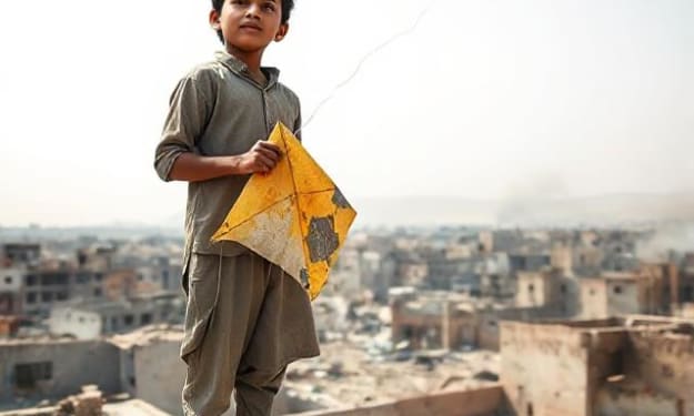 The sky over Kandahar was a pale, dusty blue, the kind that looked like it had forgotten how to rain. Bits of ash floated on the hot wind like snow from a fire, settling gently on broken windowsills and the blackened bones of buildings. Reza stood barefoot on the rooftop of a crumbling house, a tattered kite in his hand.