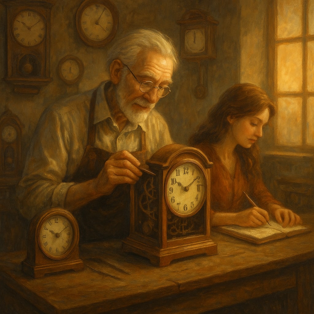 In a quiet village nestled between rolling hills, lived an old clockmaker named Eli. His shop was a magical place, filled with the rhythmic ticking of countless clocks, each one carefully crafted by his hands. Some were tall grandfather clocks with deep chimes, others were delicate pocket watches with golden gears. Yet, among all these, one silver clock stood out — not for its beauty, but because it had not ticked in years.