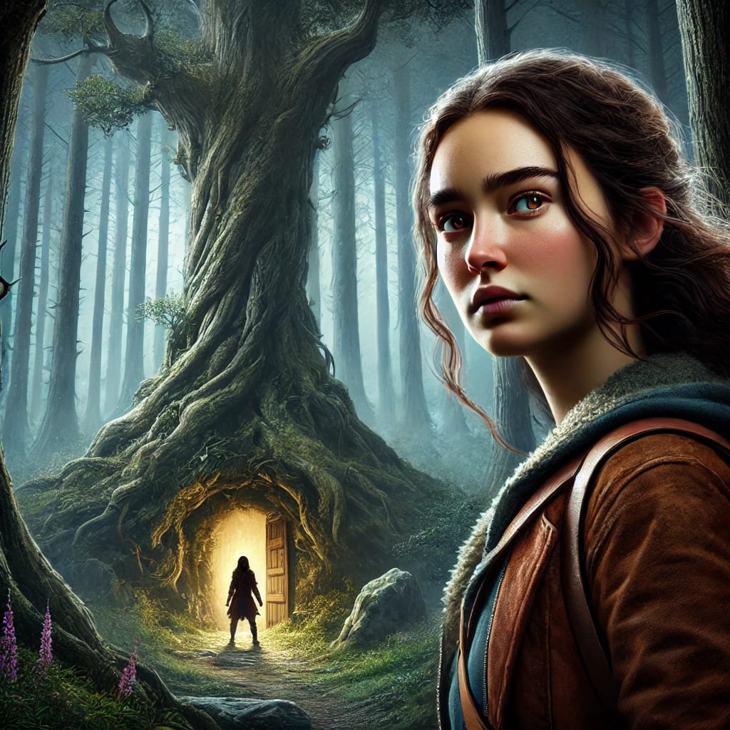 As Lena ventured deeper, she noticed the air growing cooler and the light dimming. She stumbled upon an ancient, gnarled tree with a door carved into its trunk. Intrigued, she knocked gently. To her surprise, the door creaked open, revealing a cozy, dimly lit interior. An old woman, her eyes twinkling with mischief and wisdom, beckoned Lena inside.