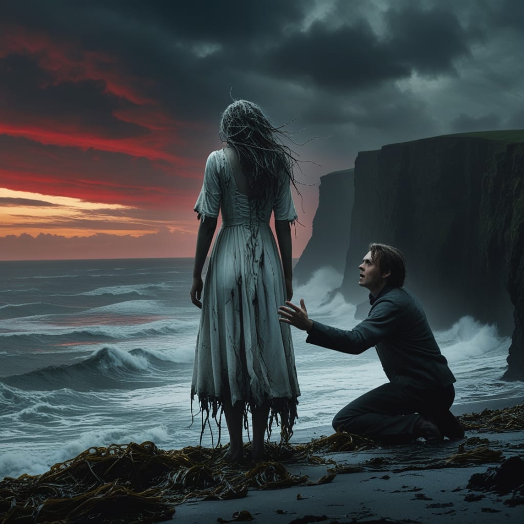 She sat in the corner of his living room, her dress dripping seawater onto the floor, her hollow eyes fixed on him. "You left me," she said, her voice trembling with rage and sorrow. "You left me alone in the dark."