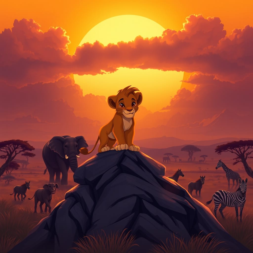 Atop the rock, King Barafu, a majestic lion with a deep golden mane streaked with gray, stood proudly. Beside him was his queen, Aisha, and between her paws, a small cub blinked up at the light for the first time. The kingdom roared with celebration: a new heir was born—Taji, son of Barafu.