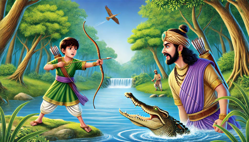 One day, Dronacharya took his students, the Pandavas and the Kauravas, to the banks of a river for a lesson in focus and archery. The atmosphere was calm, with the gentle flow of the river creating a serene backdrop for their training. Dronacharya, knowing that every student had his own strengths, was especially keen to assess their readiness and courage in facing real danger.