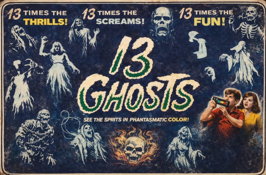 13 Ghosts is a mediocre little entry in the cult-classic oeuvre directed by William Castle, a sort of third-rung Alfred Hitchcock who made the selling of gimmick pictures his raison d’être. Castle didn’t just make movies—he made events, most of them barely qualifying as cinema.
