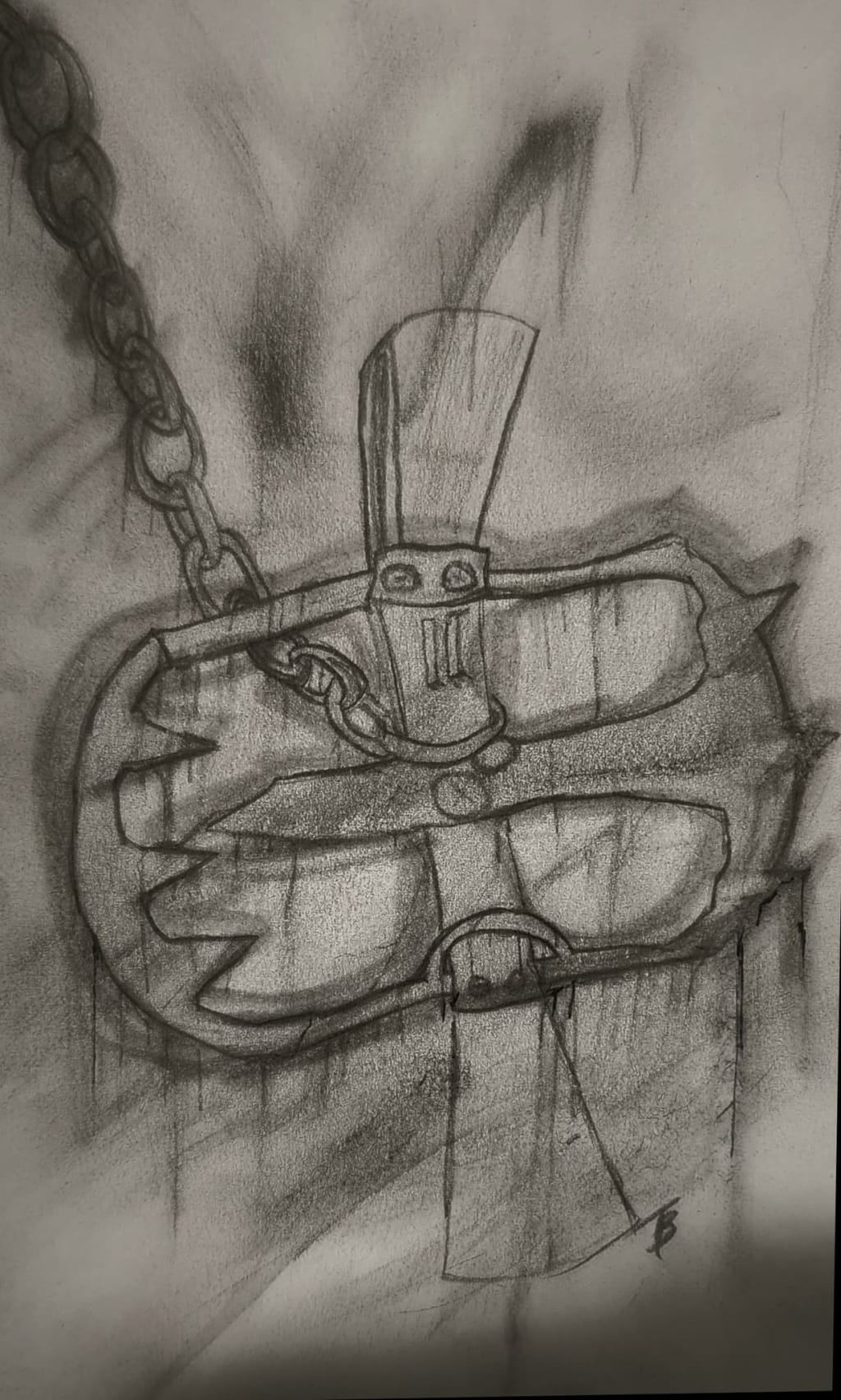 Thank God, he thought, someone found me. Pushing himself up to a stance, he found himself face to face with a bloated, grey and mutilated corpse. One eye was missing, the other sagged down along his exposed cheek bone. His lips pursed open and peeled back into a scowl. His teeth were brown and yellow stained by grave dirt. His matted hair laid in pieces against his exposed scapula's, skin hung like ribbons from his chest and ribs...
