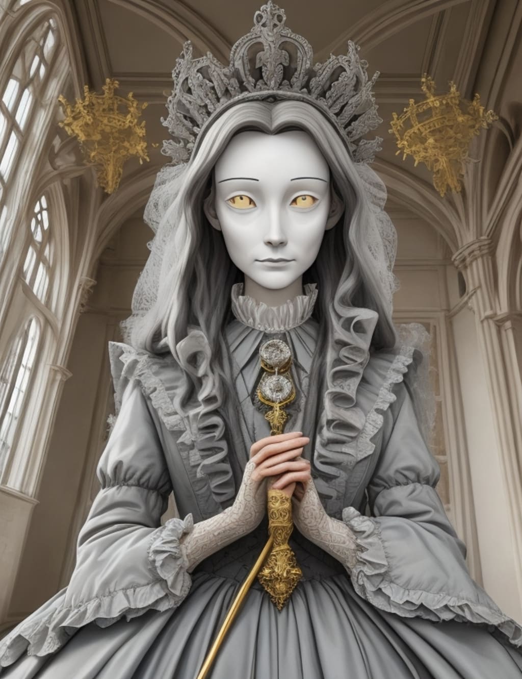 The Grey Lady has been described by witnesses as a spectral woman wearing a grey gown with a veil covering her face. Her spectral appearances are frequently reported, with sightings occurring in the Haunted Gallery—a poorly lighted hallway thought to be among the palace's most paranormally active regions. It is believed that the Grey Lady glides around the gallery, her ethereal presence making a lasting impression on everyone who comes into contact with her.