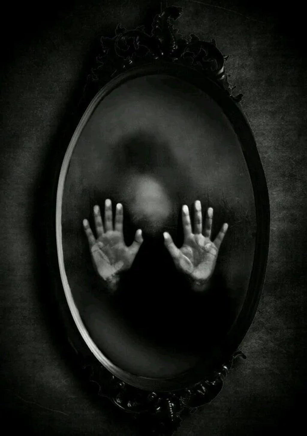 But as I looked into the mirror, I saw that I stood alone, and that my reflection showed me as though death itself had washed over me. My skin had turned gray, and my eyes sank deep into my skull. My jaw hung loosely as though it had been broken and a dark shadow slowly rose behind me as its rested over my shoulders.