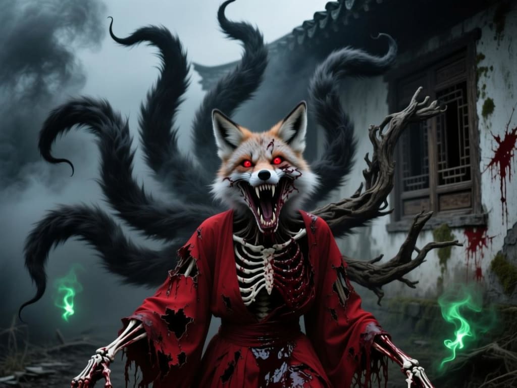 Finally, she was brought to the marble stone covered with a red cloth. An inexplicable curiosity drove her to reach out and uncover the red cloth - the seven foxes on the stone were staring at her, their eyes red as if they were about to bleed, even more ferocious than what had been rumored. She turned around to run away, but the largest fox on the stone suddenly moved, leaped off the marble stone, and its body swelled at a visible speed, instantly reaching the top of the building. The huge fox held her tightly with its sharp claws and growled from its gaping mouth, "Insignificant human, how dare you disrespect me, the great fox immortal, by hosting a banquet? I will bite your child to death!"