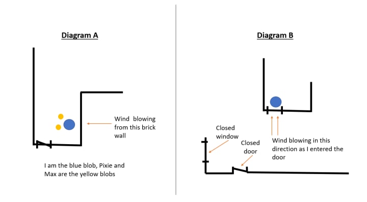 It was a normal weekend morning, I was outside patting my two Jack Russell dogs, Pixie and Max. They were adorable (their adorableness is not relevant to my story, may they rest in peace). The spot I was sitting was against a wall. To get into the backyard it is a ‘U’ shape and I was sitting against one of the brick walls of the ‘U’ shape. (Visual learners please see diagram ‘A’ below). The dogs became unsettled making a crying noise; wind began blowing on me from the brick wall. I was scared and confused, how could wind blow from a wall? Why were the dogs freaking out? Am I going crazy? The wind was strong enough that my hair was blowing with it.
