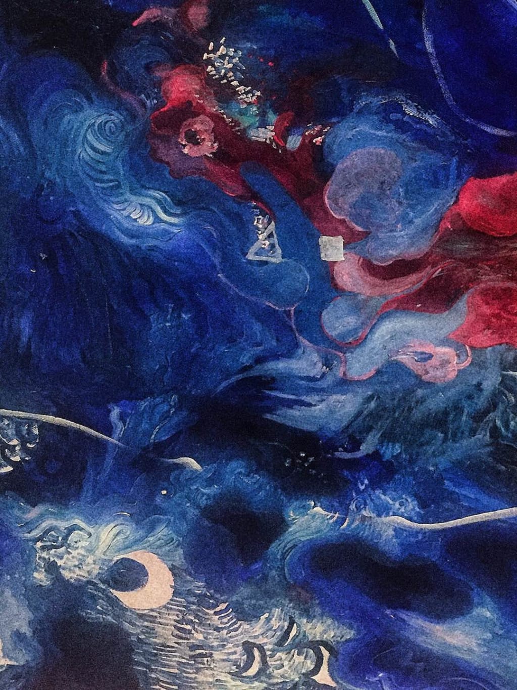 The angel was made entirely from glass, breaking the light into a million pieces at the sun’s rays pass through its pristine body. The small angel was asleep underneath the canopy of a fig tree, his silver frays gently frames a familiar face, there was only a slight peak from the eyelids, as if the angel wants to wake up from his sweet slumber, showing the viewers a sliver of the most dreamy---- aquamarine blue.