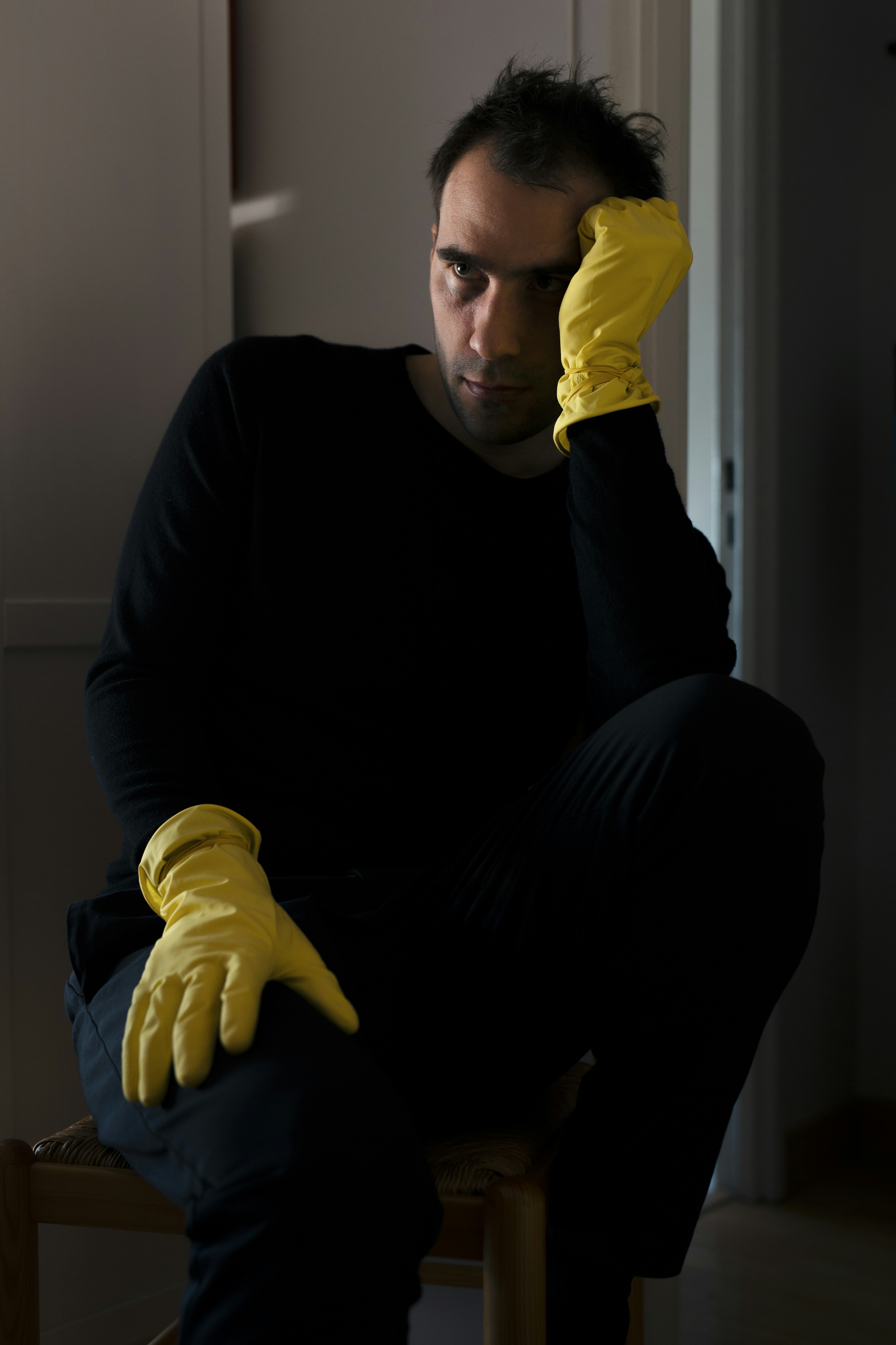 He turned the chair around and faced me, resting his head on the back of our carved set of knock-offs.