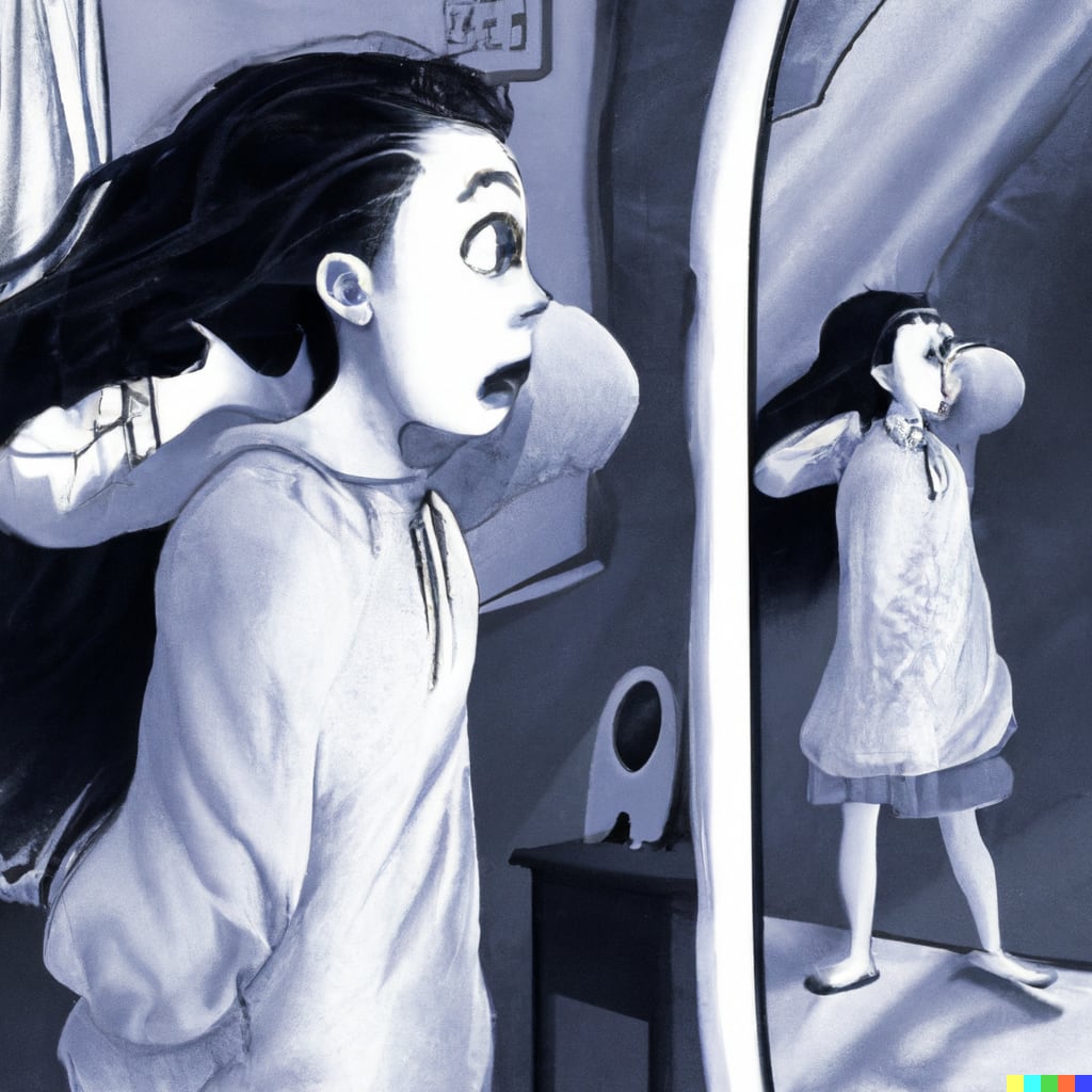 As she watched, the reflection began to warp and twist, until she could see the shadowy creatures from the mirror world lurking in the corners. They seemed to be beckoning to her, calling her back into the mirror world.