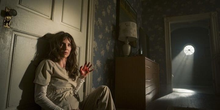 Malignant stars Annabelle Wallis as Madison, a woman in an abusive relationship. When Madison returns home from work she gets into an argument with her husband, Derek (Jake Abel). He shoves Madison’s head into the wall hard enough to break the wall and cut Madison’s head open. He leaves, she locks him out of the bedroom and worries how his abuse might have affected her unborn child.