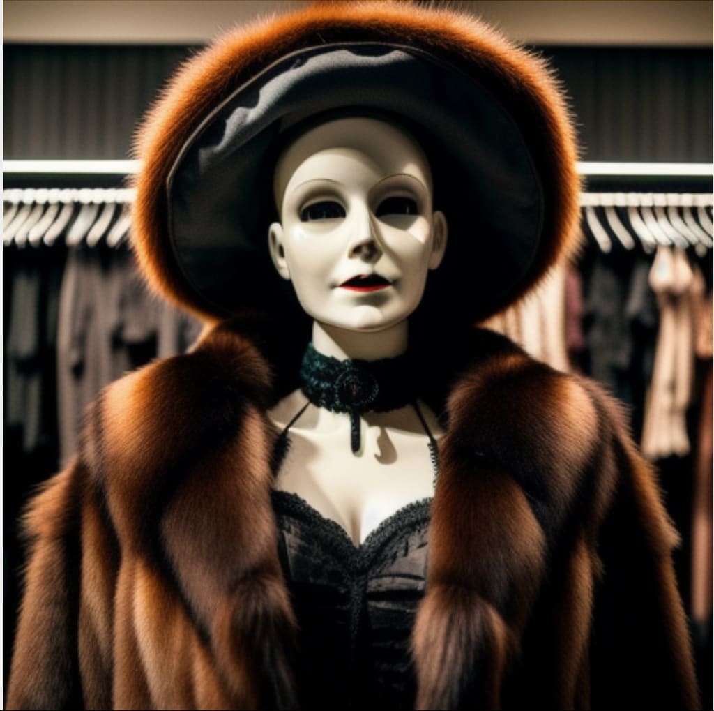 The clothes adorning these mannequins were of exceptional quality, exuding an air of grandeur. I found myself fixated on one mannequin in particular, wearing an impressive fur-lined overcoat. Its expression was the epitome of despair, and against my better judgment, I felt an inexplicable urge to reach out and touch the coat.