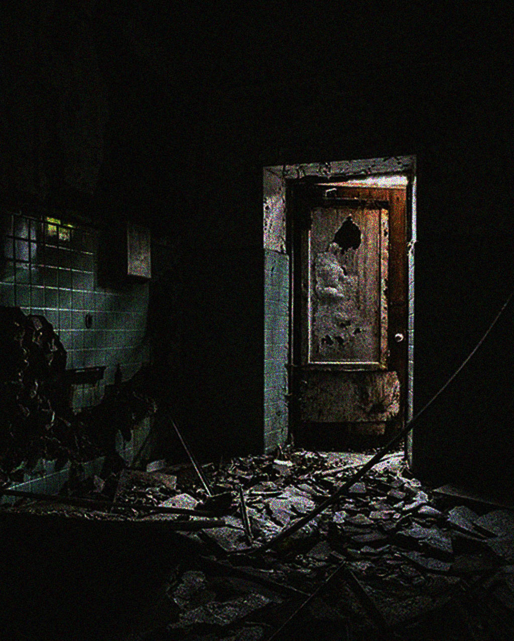 He goes in, stepping over broken glass. He finds himself holding his breath as he goes up the stairs, as if that will somehow make him lighter as he listens to aged wood creak and groan under his shoes.