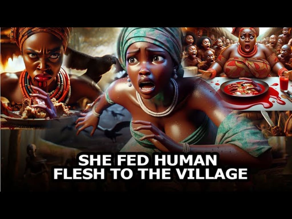 Back in the village, Kwame and Ogi gathered the elders and other trusted villagers to recount the horrors they had witnessed. The village was plunged into shock and fear as they listened to the couple’s tale. The missing men, the strange behavior of the customers, the foul stench—it all made sense now. Amma was not just a skilled cook; she was a dark sorceress, using human flesh in her deadly recipes and enchanting the men to become addicted to her food.