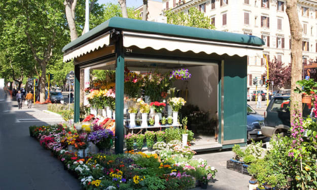 The old man sat in front of his kiosk with his flowers arranged and displayed in front. In the back through the little wooden door where he sat in the rain was his extra inventory. He watched as the people walked by, some of them stopping to admire his flowers some of them buying some, asking him how he got them to look so vibrant or how they smelled so good. He just smiles, thanks them for the compliment and watch’s them go on their way.