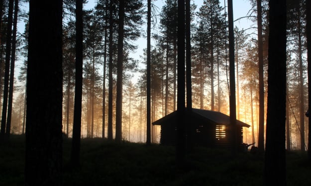 The cabin in the woods had been abandoned for years, but one night, a candle burned in the window. The heavy dusk sun set the sky ablaze, rich orange glowed behind the Scots Pine, silhouetted for miles over the horizon. The warm August air carried a light breeze, gently disturbing the first few leaves evident of an early autumn that scattered the forest floor. The air still and soft, slightly sweet with the scent of the pine sap excreted from the tall, ancient trees, and lush moss that carpeted the forest beneath the golden leaves.