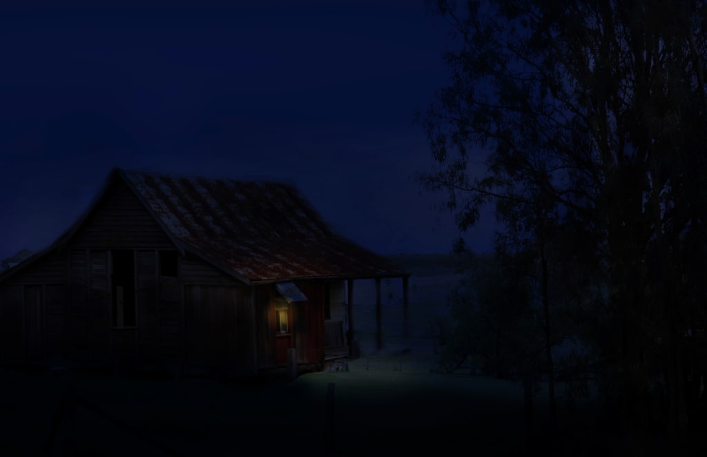 Ben knew better than to try to force an animal in Rusty’s state and he looked around for any clue as to what had happened. That was when he saw the light. It was nothing more than a tiny yellow prick in the vast expanse of the valley. In the dimness, Ben could just make out the outline of a stockman’s hut. From it’s one and only window, the fragile glow shone gamely between the trunks of silvered grey gum trees.