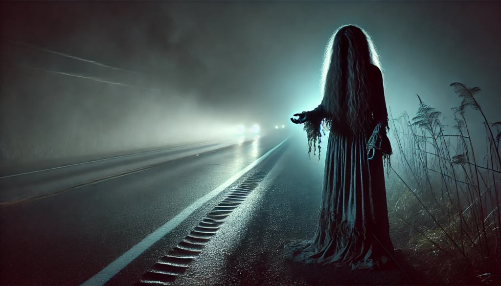 The night was dark, with only his headlights slicing through the thick mist that hung over the road like a heavy blanket. As he drove, Mike noticed a figure standing on the side of the road, barely visible in the fog. It was a woman, dressed in old-fashioned clothes, her hair wild and tangled. She held out her thumb, signaling for a ride.