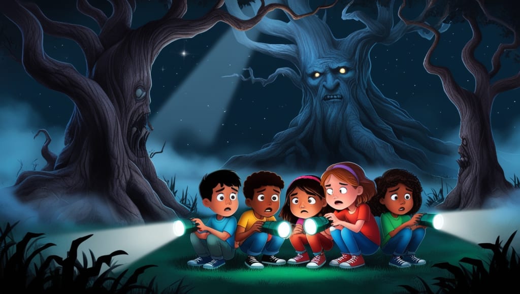 As they stood there, the trees began to rustle, and the air filled with strange sounds—cries, whispers, and laughter. The friends could feel the trees drawing energy from their fear, their hearts pounding in their chests.