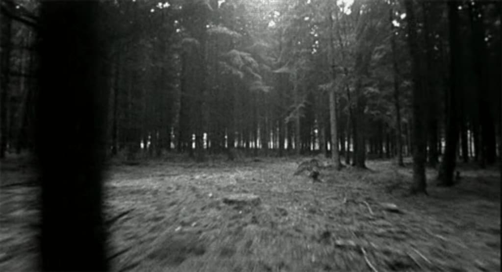 Blair runs through the woods with her dirty blonde hair swooshing around her as she repeatedly moves her head around her surroundings in a fast motion.