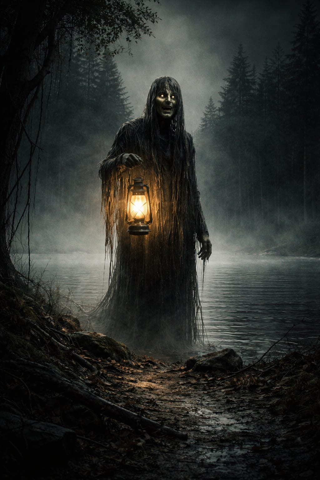The figure looked tall and thin, holding the lantern low near the water. But something about the shape felt wrong—unnatural.