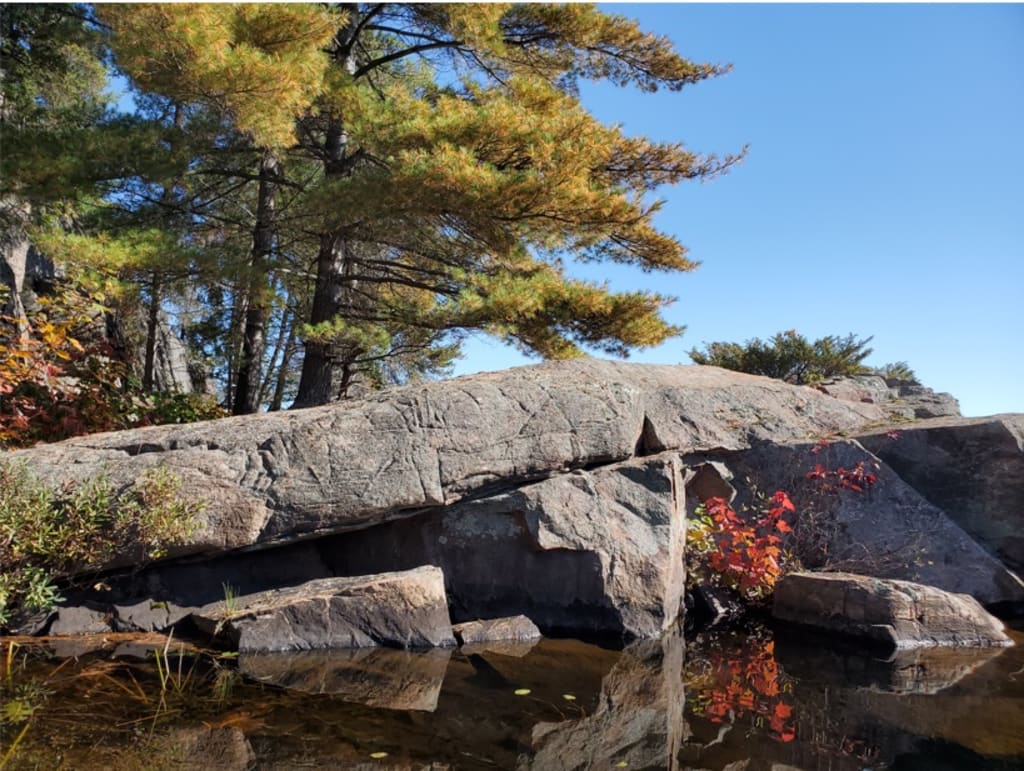 They rose early the next day and ventured out into the morning waters of Grand Lake while the sun was still at work dispersing the floating fog clouds. They rowed out at a leisurely pace, making it down to Carcajou Bay by noon. Finding an array of islands in the Bay intermingled with a variety of cheerful waterfalls, they brought their canoe to shore and had a refreshing dip in the brisk autumn waters. The day passed quickly and it was not until later in the afternoon that the couple found themselves gliding up to the orange stained cliffs in search of the promised pictographs.