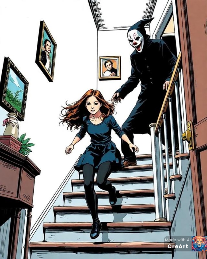 Seeing something outside the house, Chloe's blood ran cold. Even though the streetlights were on, and the street looked as peaceful as ever, she swore she saw someone standing in her front yard, dressed in all black with a clown mask and holding a long knife. The figure stood there, watching the house, and, when it saw Chloe staring at it from the thinly curtained living room, it actually raised its hand and waved at her.