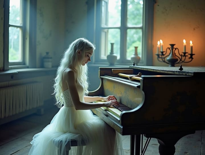 She found the room at the far end of a grand hallway. A figure was sitting at an old, beat-up piano when the door opened. It was a woman with her back to Amelia and a grace that seemed out of place for someone who clearly was not alive as she moved her fingers across the keys. The woman's white dress glowed faintly in the room's dim lighting, and her long hair fell down her back like a river of midnight.