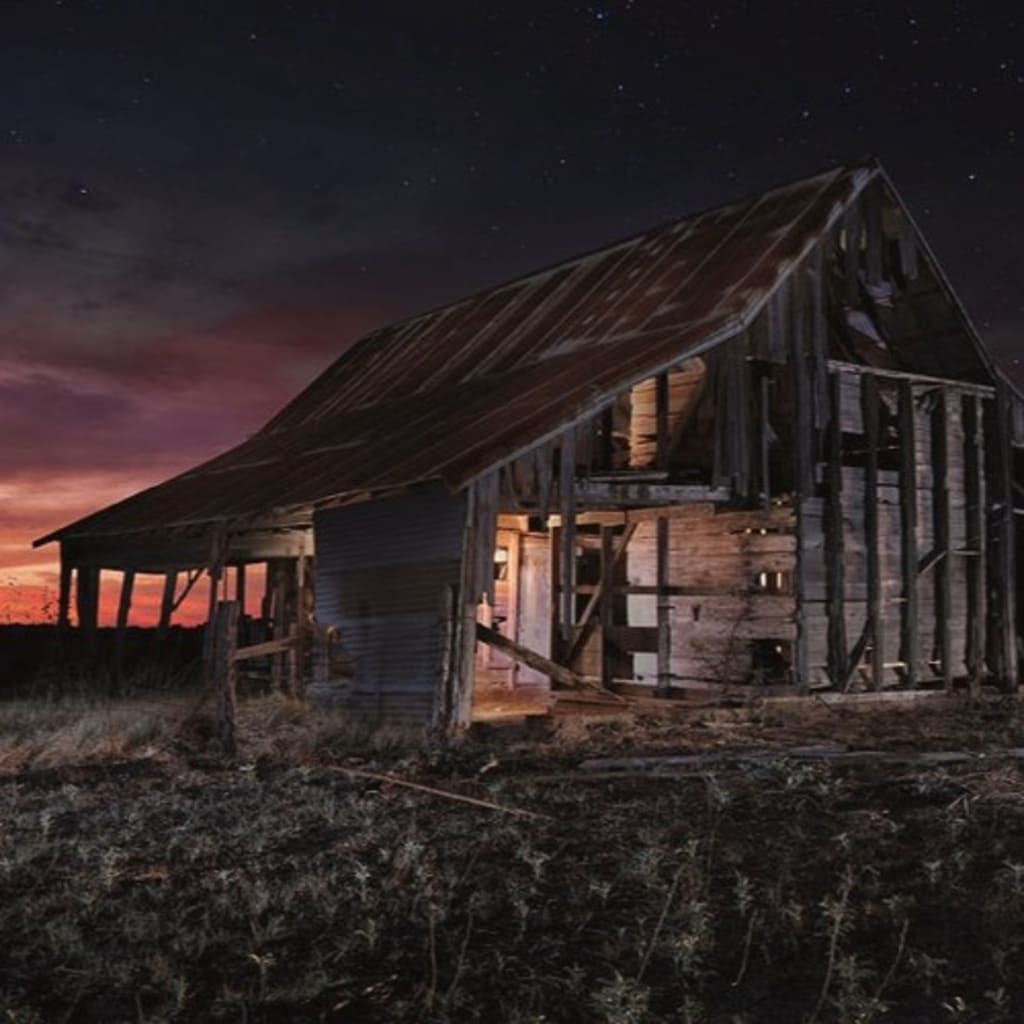 He jammed his boot in between the barn doors and pried the door open. The only light illuminating the interior of the building came from the cracks between boards, the open door, and a single lightbulb that hung in the center of the room. He had always been unsettled by the eerie darkness of the barn, only being filled with fluorescent lighting and the faint remnants of screeches.