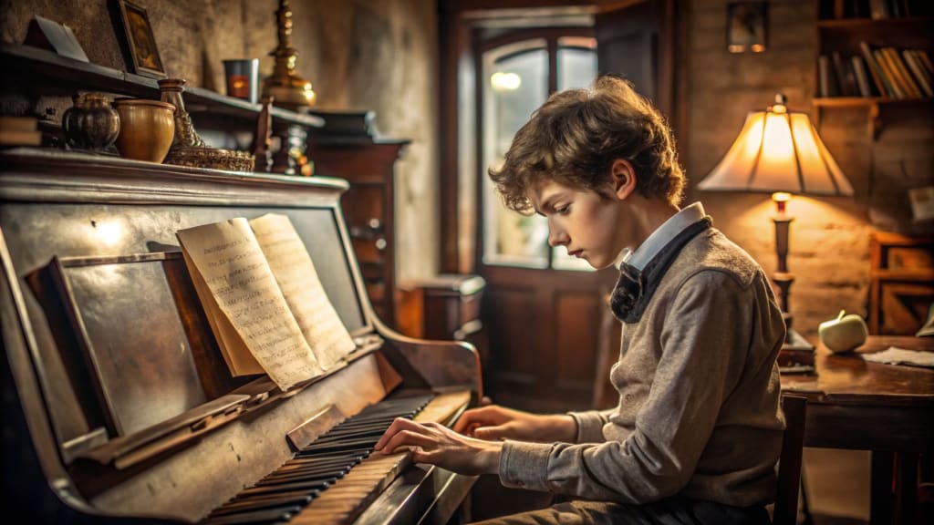 In a small town nestled between rolling hills and dense forests, there lived a talented musician named Alex. Alex was a high school sophomore who loved playing the piano. He spent hours in his room, practicing new songs and dreaming of one day performing on grand stages. His fingers danced over the keys, creating beautiful melodies that filled his home with warmth and joy.