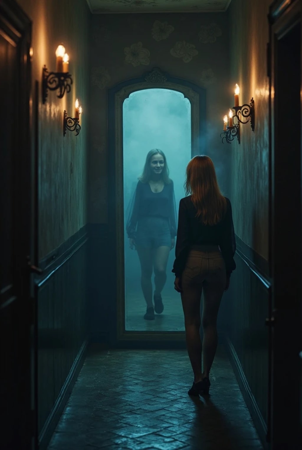 I spun around. My reflection — if that’s what it still was — now had its hand pressed against the inside of the glass. My real hand hung by my side. The candlelight flickered, and the hallway grew colder. I could see my breath.